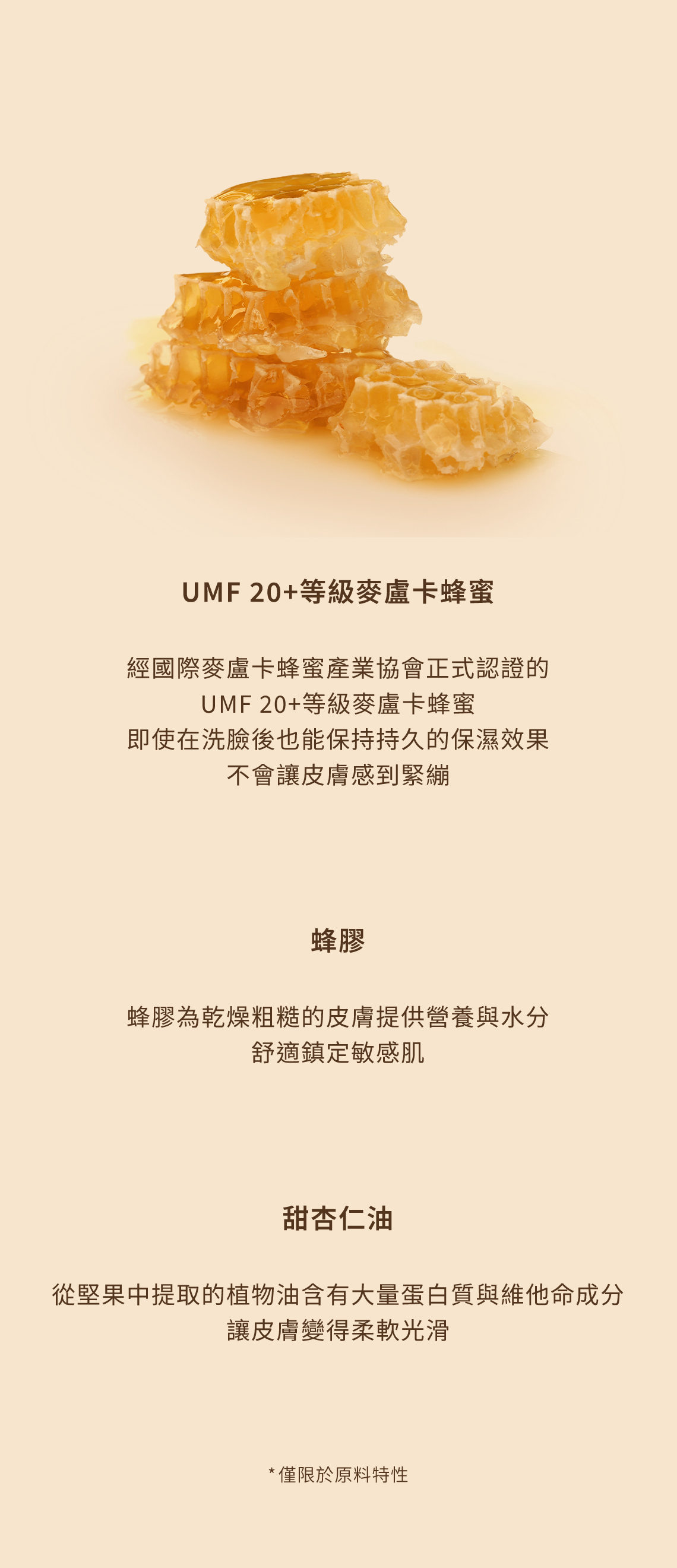 ·UMF 20+等級麥盧卡蜂蜜,即使在洗臉後也能保持持久的保濕效果。